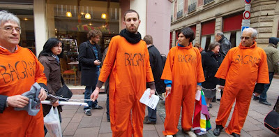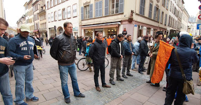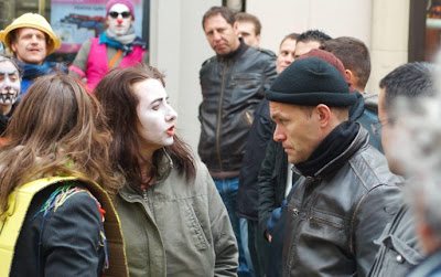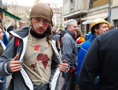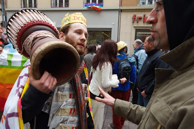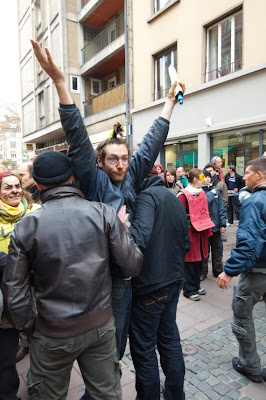 De jeunes clowns anti-OTAN se sont vu stopper dans leur circulation vers le centre-ville par un cordon de policiers en civils. Confrontation bon enfant entre des militants grimmés et des policiers sans signe distinctif, mutiques, fermés.