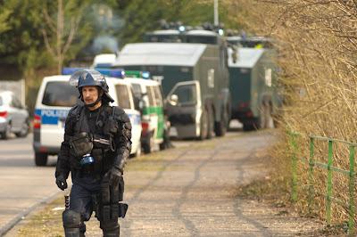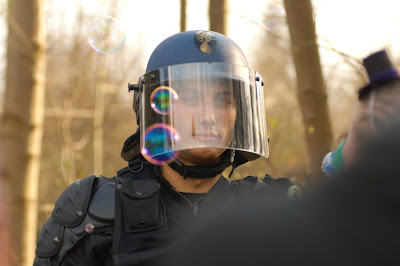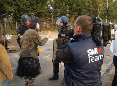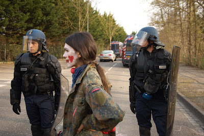 Les gendarmes mobiles, appuyés par leurs homologues allemands, empêchent l'accès au village des anti-Otan pendant plusieurs heures. A quelques centaines de mètres, vers le village, de régulière détonnations retentissent suivies par des nuages de gaz lacrymogène.